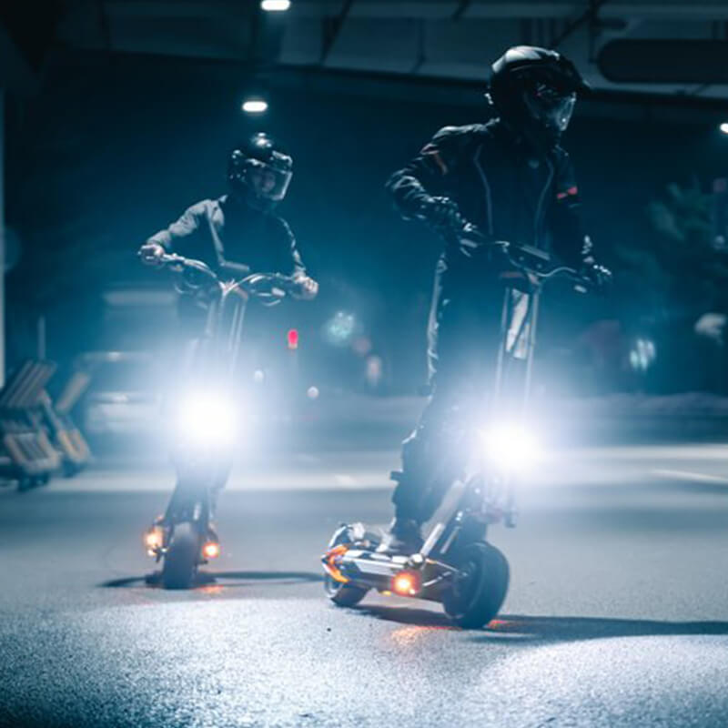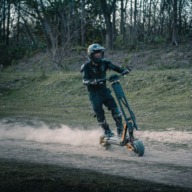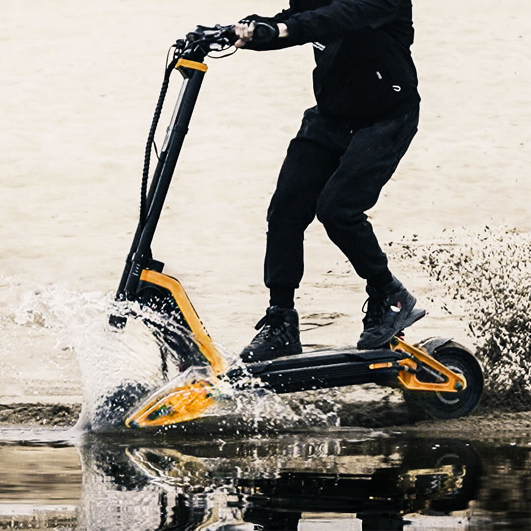The RS (Racing Sport) is built for speed, range, and rider adaptability. It is a powerful dual-motor off-road electric scooter with 4-level adjustable suspension, an IPX7 waterproof battery, Zoom hydraulic brakes, and DIY-friendly upgrades.